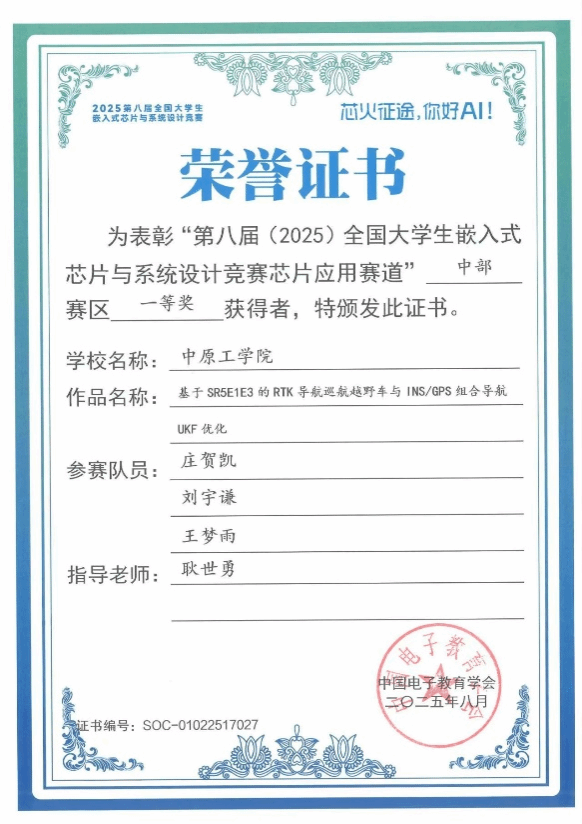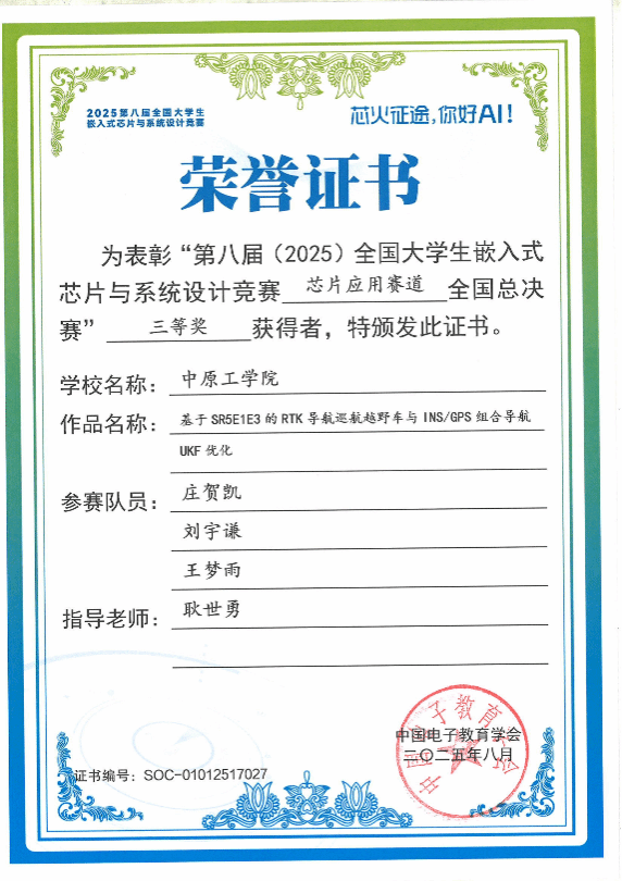 近日,第八届全国大学生嵌入式芯片与系统设计竞赛全国总决赛在南京集成电路培训基地举行。由我校太阳集团tcy8722耿世勇老师指导,庄贺凯、刘宇谦、王梦雨团队提交的作品“基于SR5E1E3的RTK导航巡航越野车与INS/GPS组合导航UKF优化”荣获应用赛道总决赛三等奖。